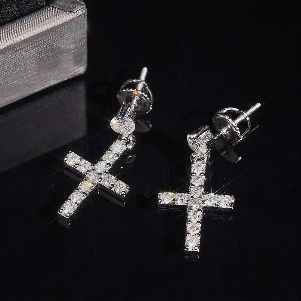 Stay chic with these vvs moissanite diamond fashion cross stud earrings crafted with sterling silver. Moissanite stones with a round brilliant cut glimmer in a classic claw setting, these earrings make a perfect gift for any jewelry lover.