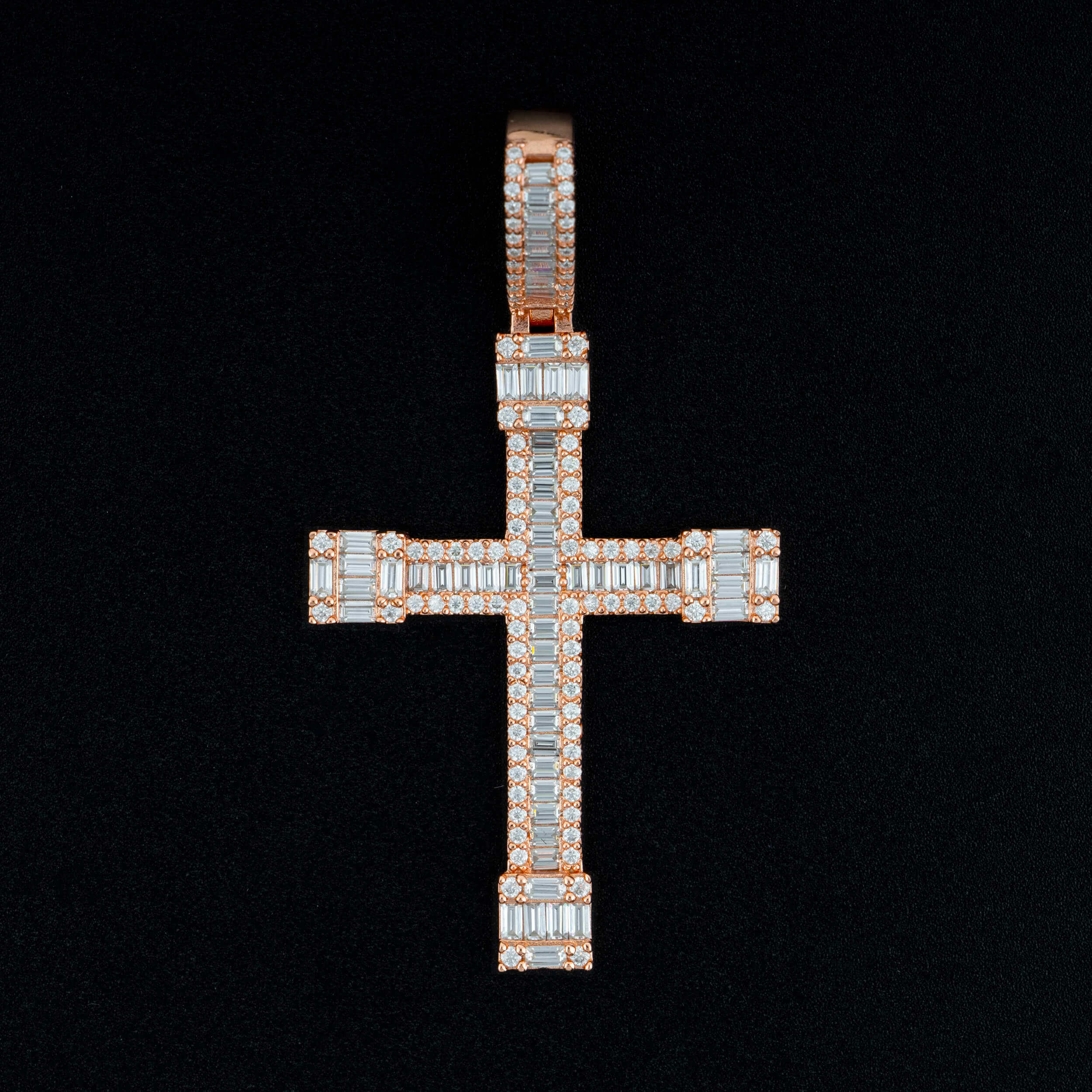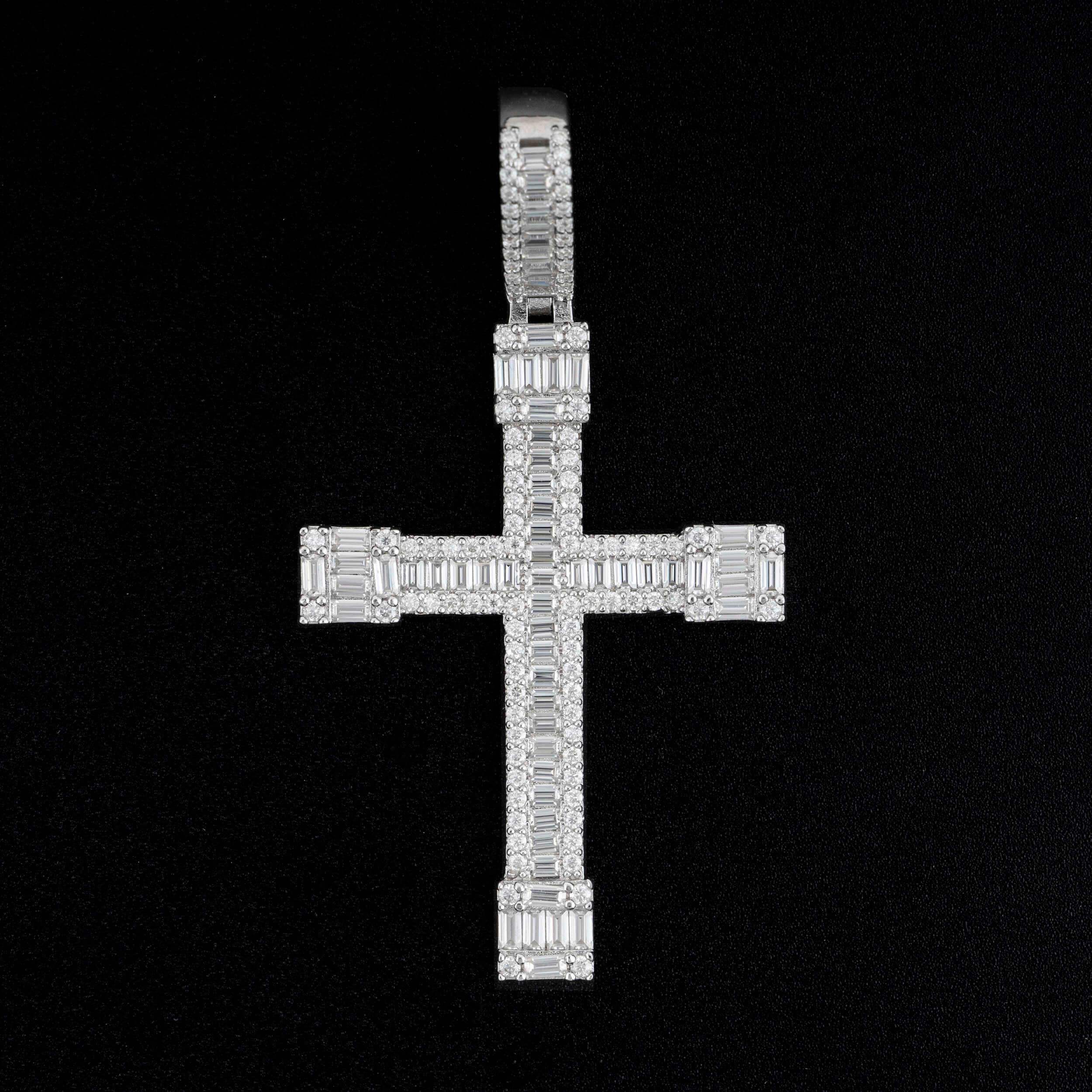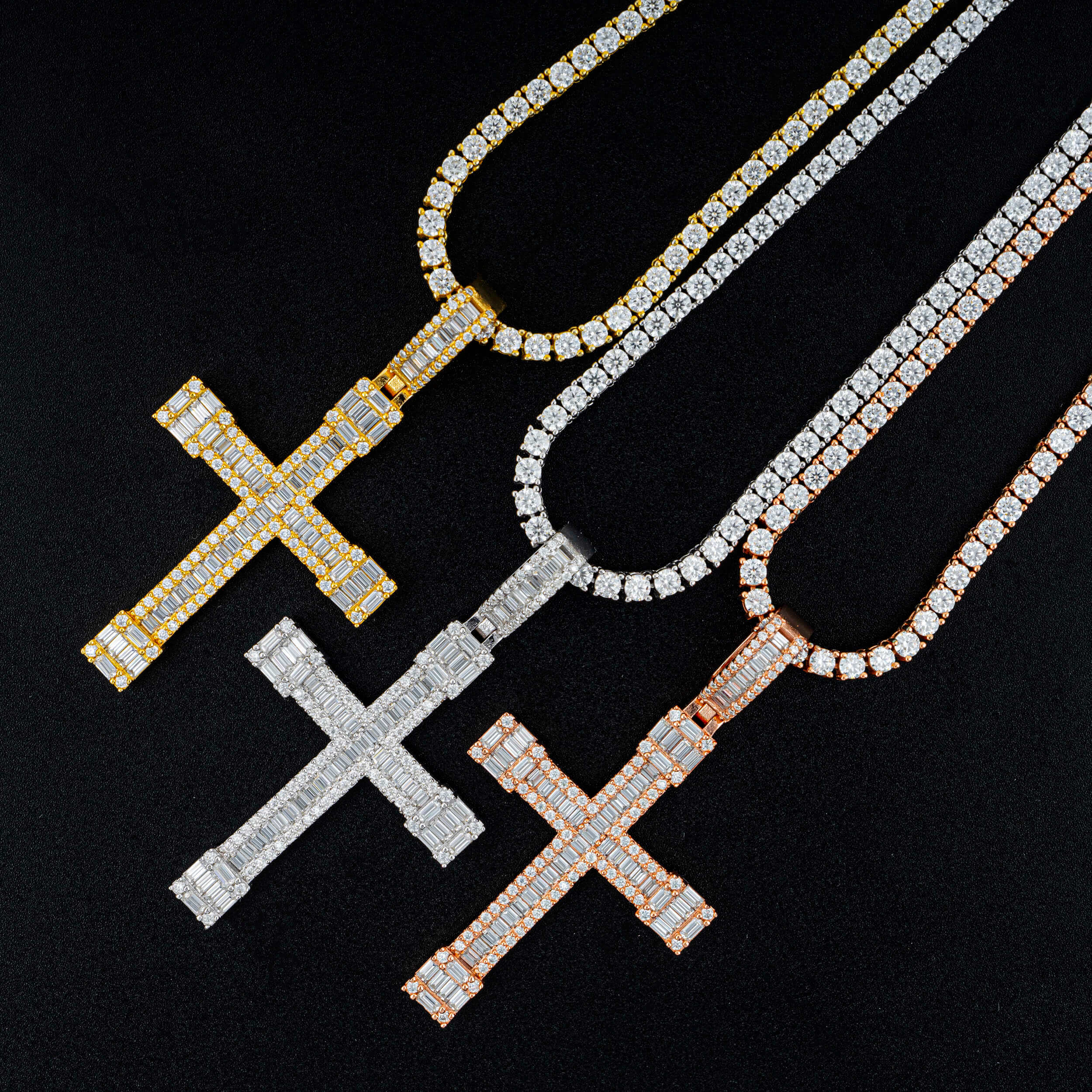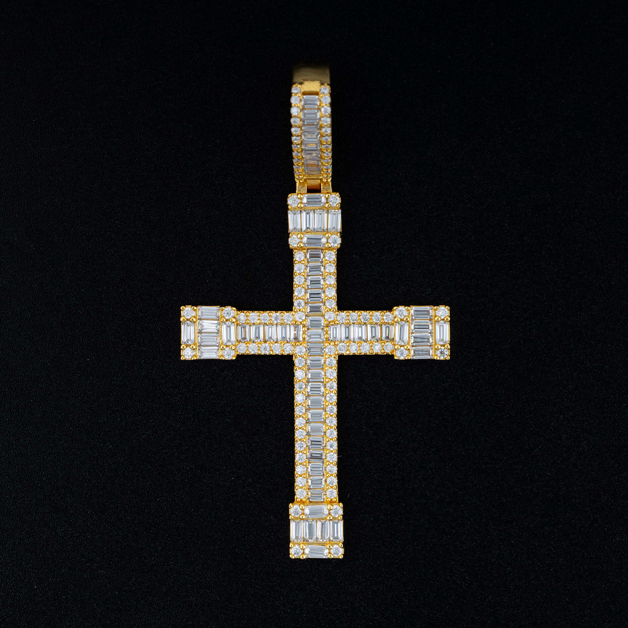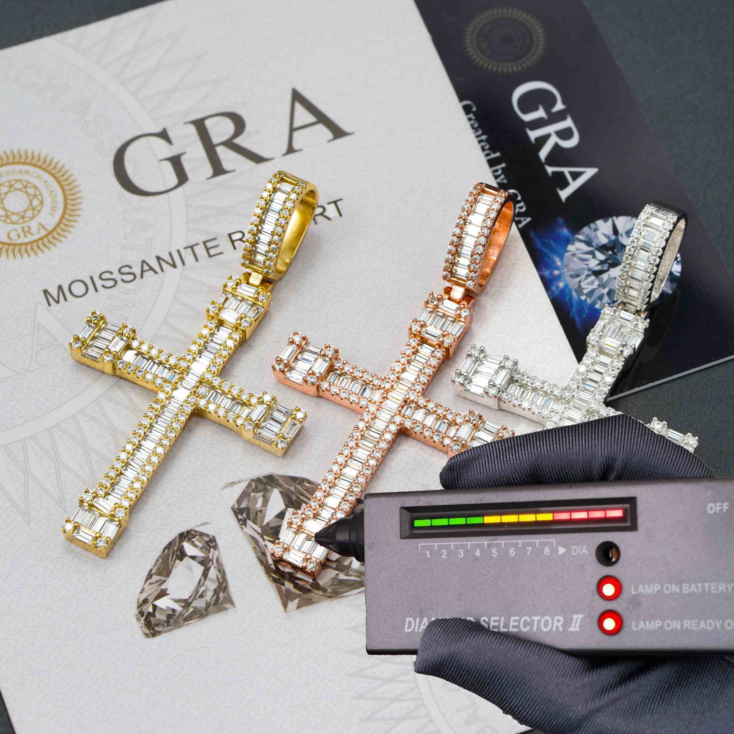This stylish pendant is made of sterling silver with a gold plating. It features a vvs moissanite stone in a round brilliant cut. Perfect for unisex, this cross-shaped pendant is a hip hop iced out Christian Jesus design.