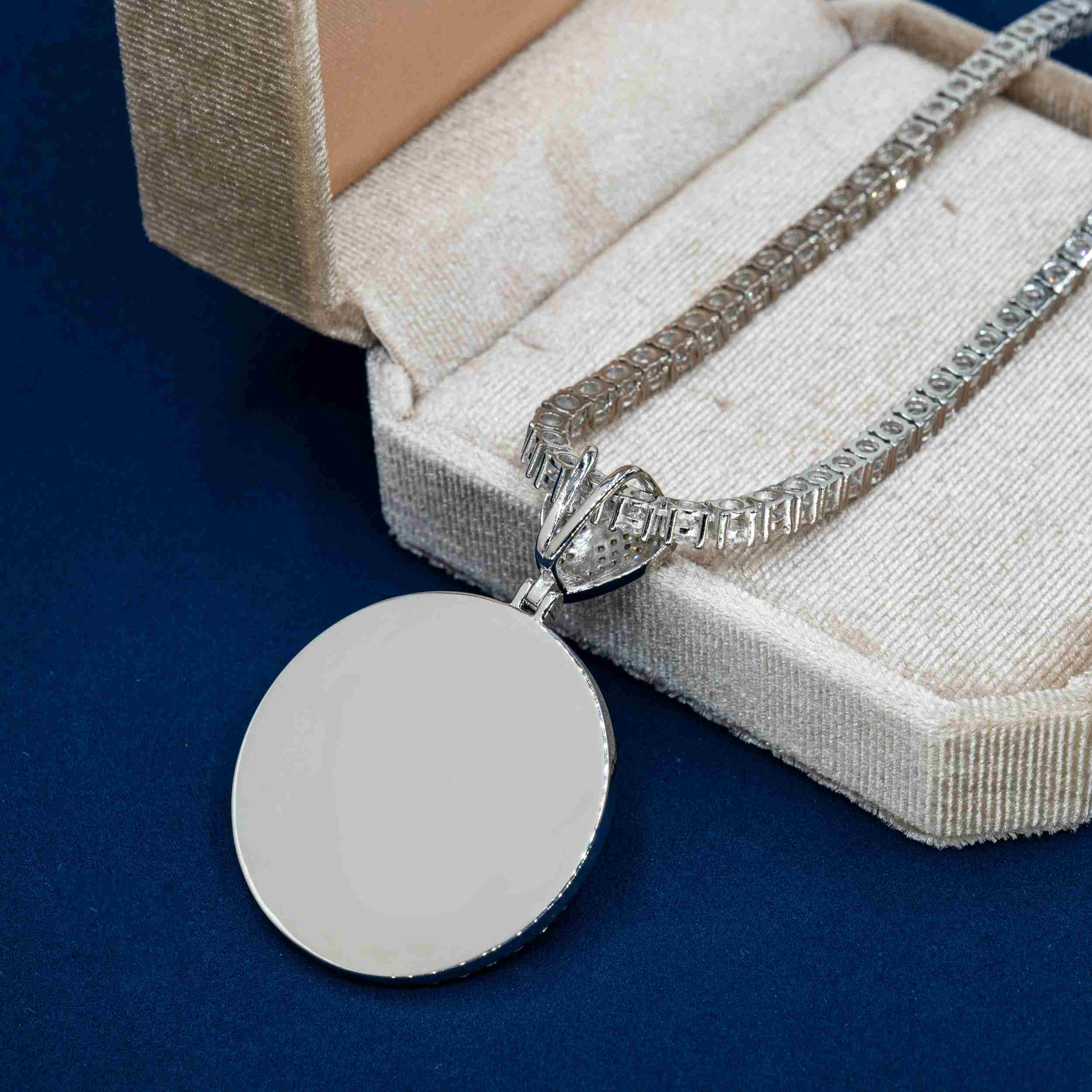 Adorn yourself with a Custom Photo Pendant VVS Mozambican Stone Pendant. This exquisite piece of jewelry features a 0.7-carat VVS Mozambican stone for a dazzling look. An adjustable chain adds the perfect finishing touch. Showcase your personal style with this beautiful pendant.