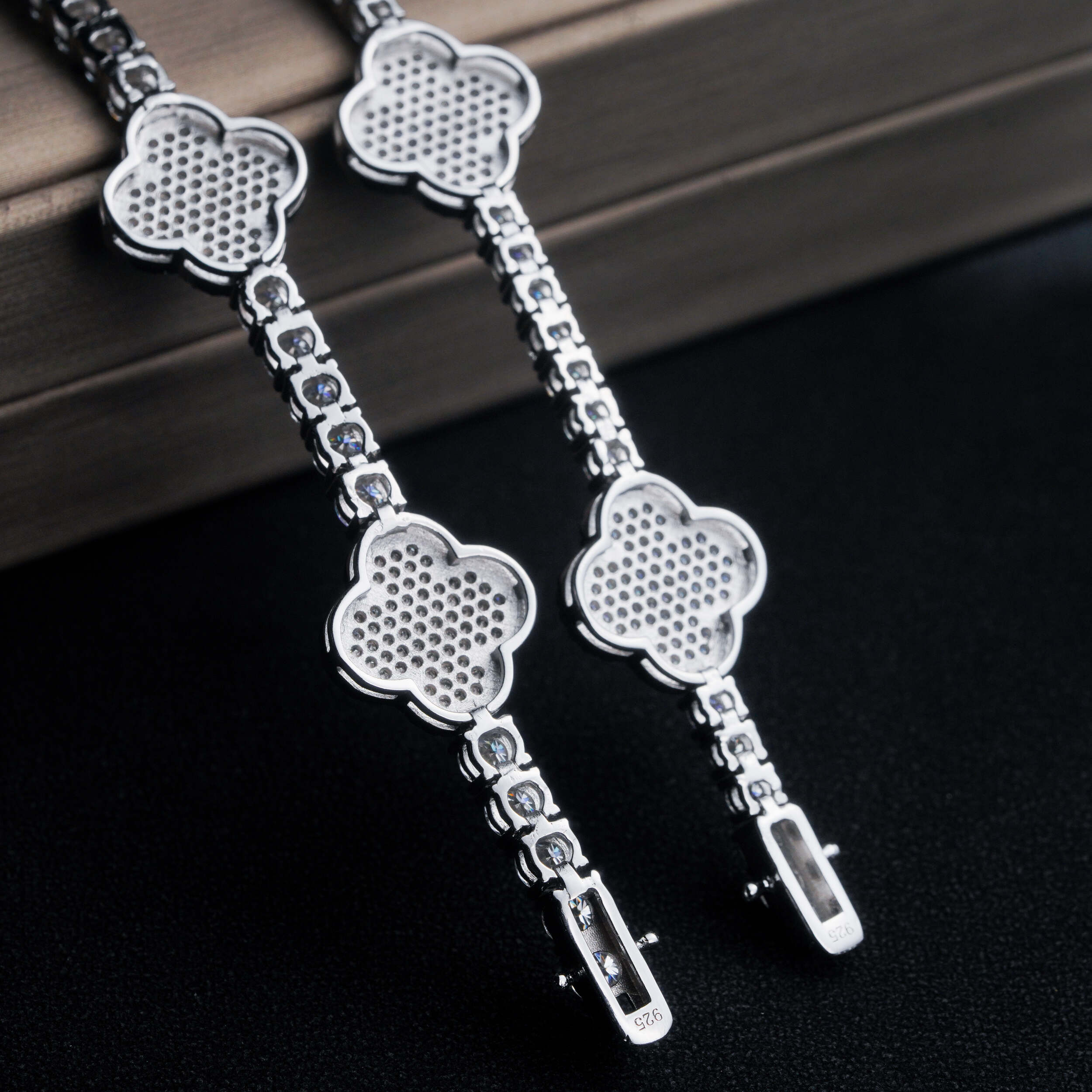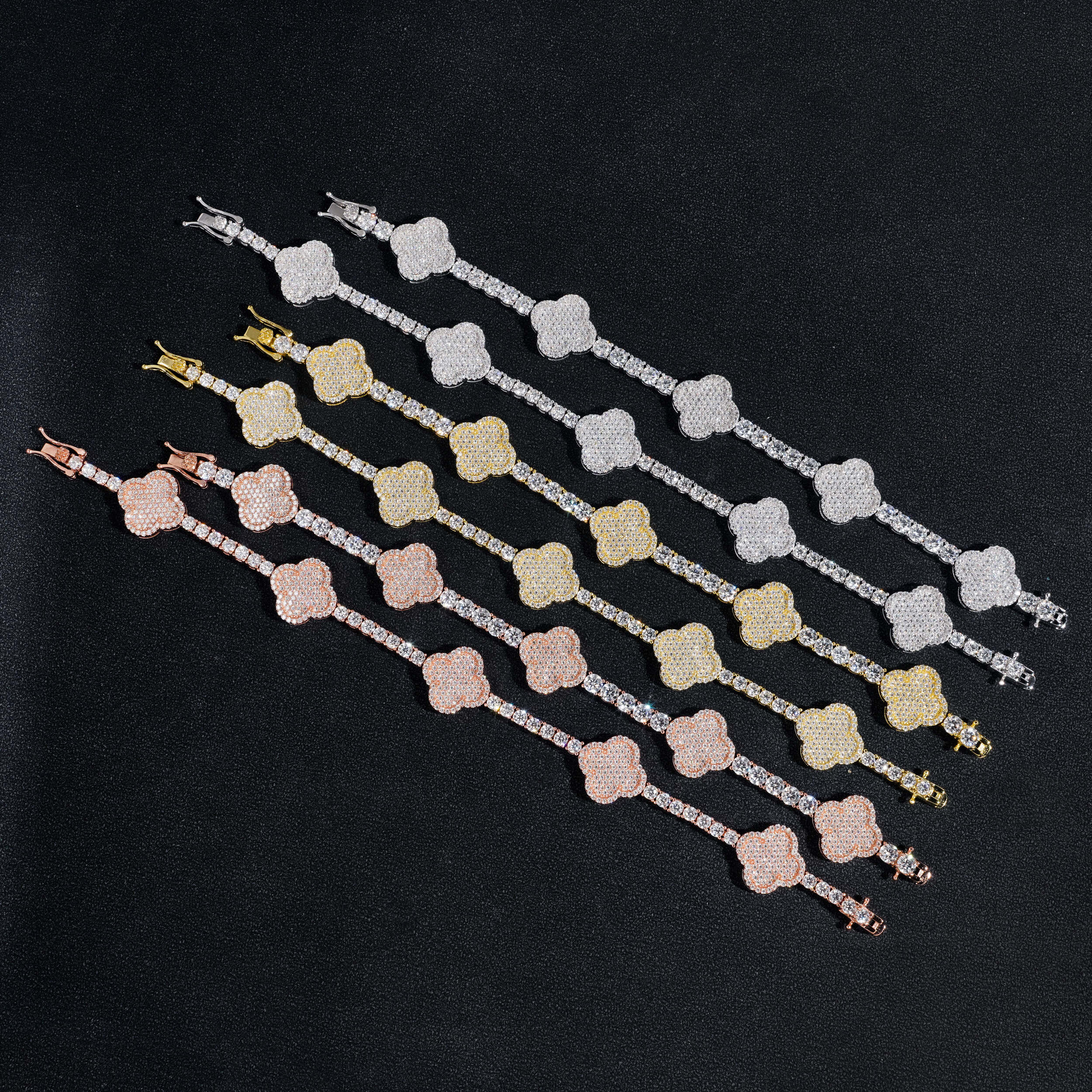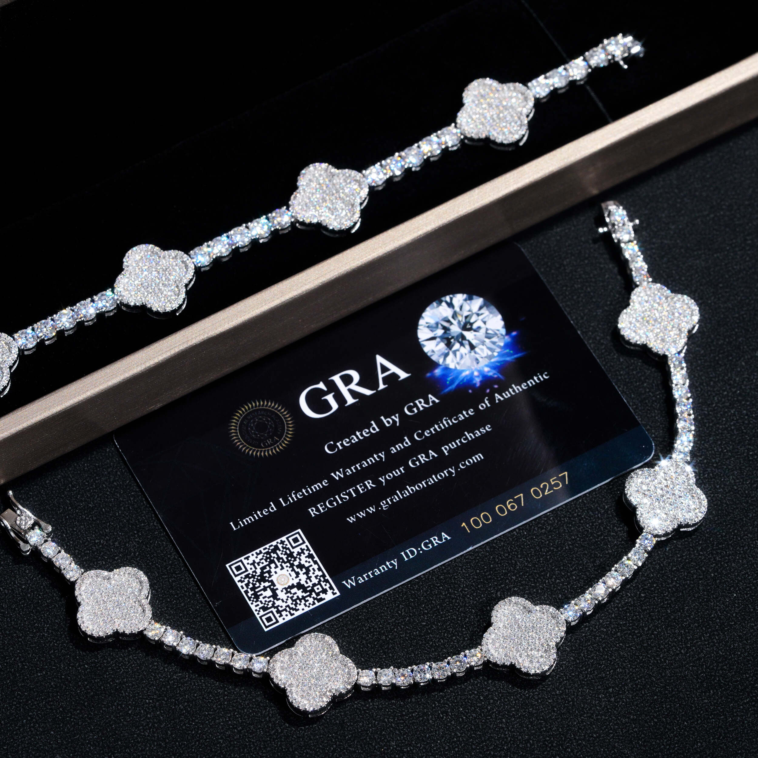 This Four leaf Clover 925 Silver VVS Moissanite Bracelet Tennis Chain is expertly crafted with quality materials and features a unique four-leaf clover design.