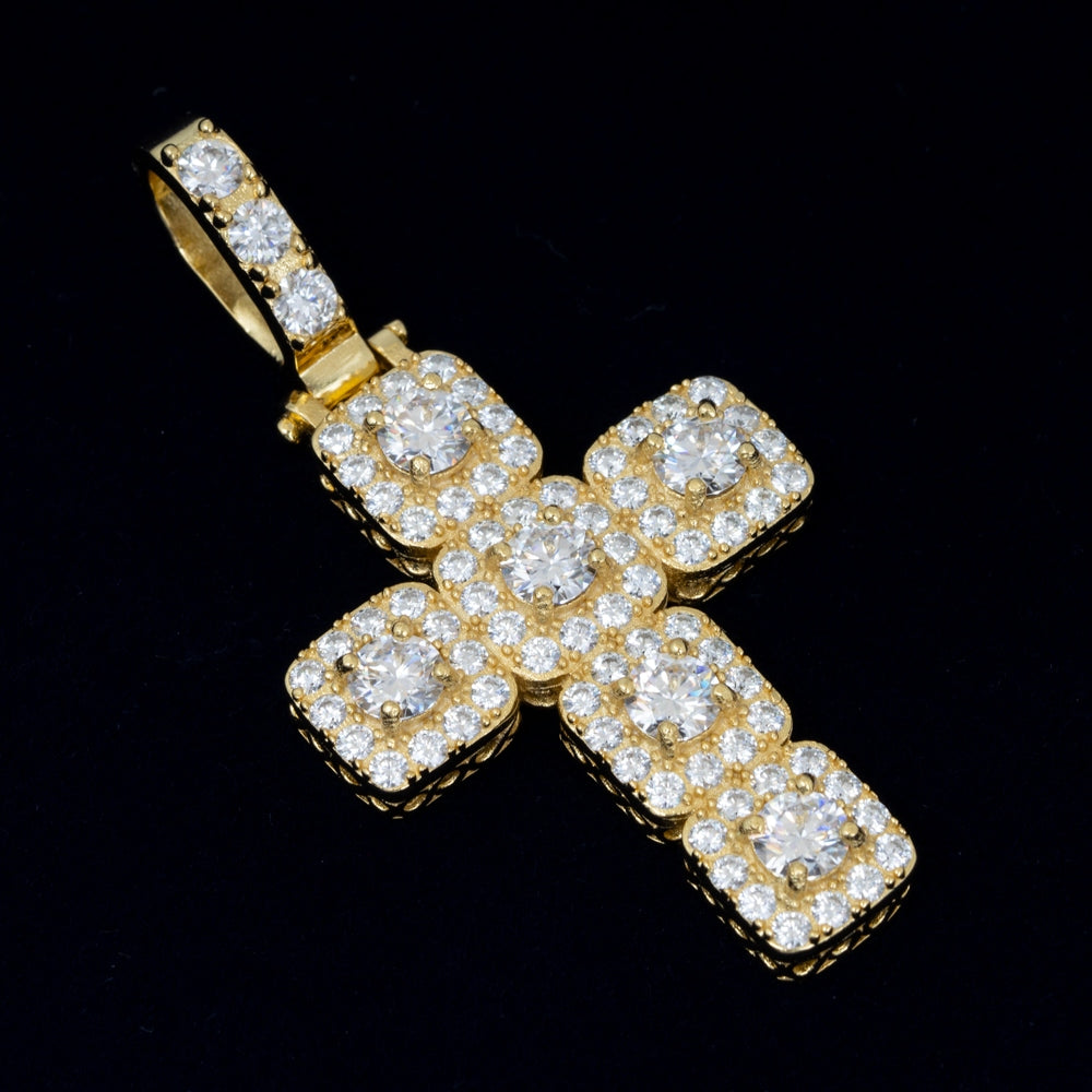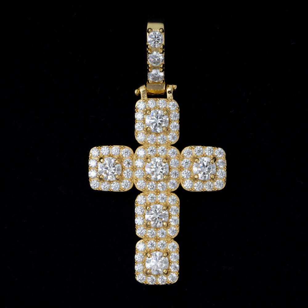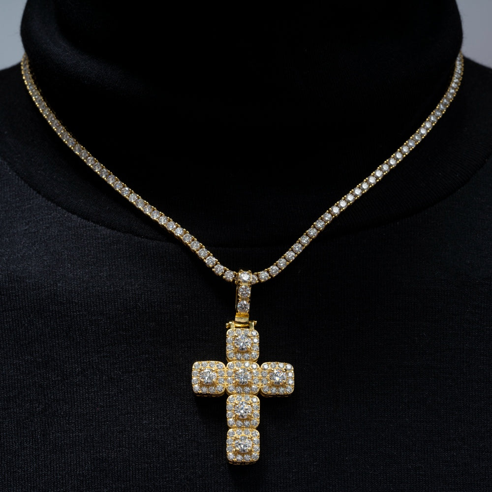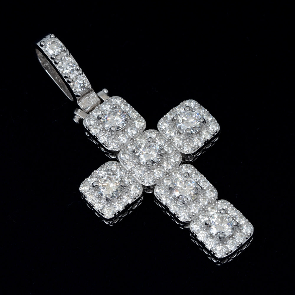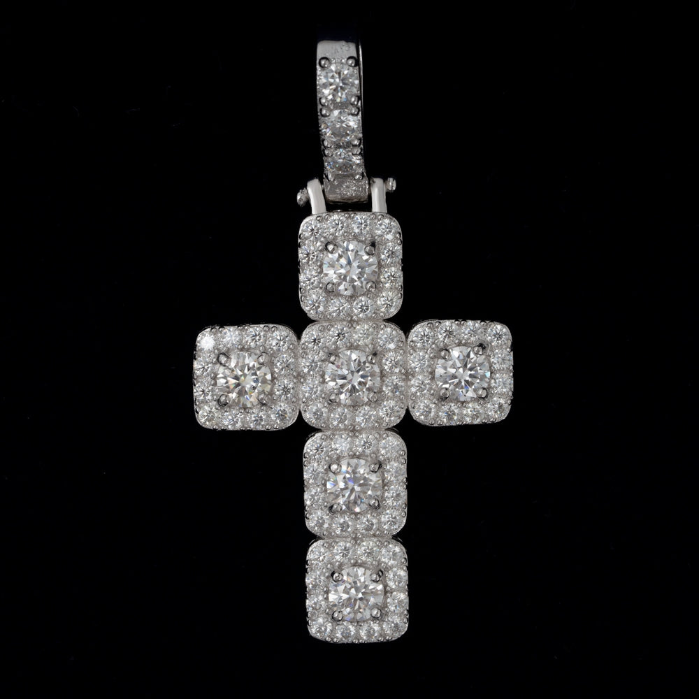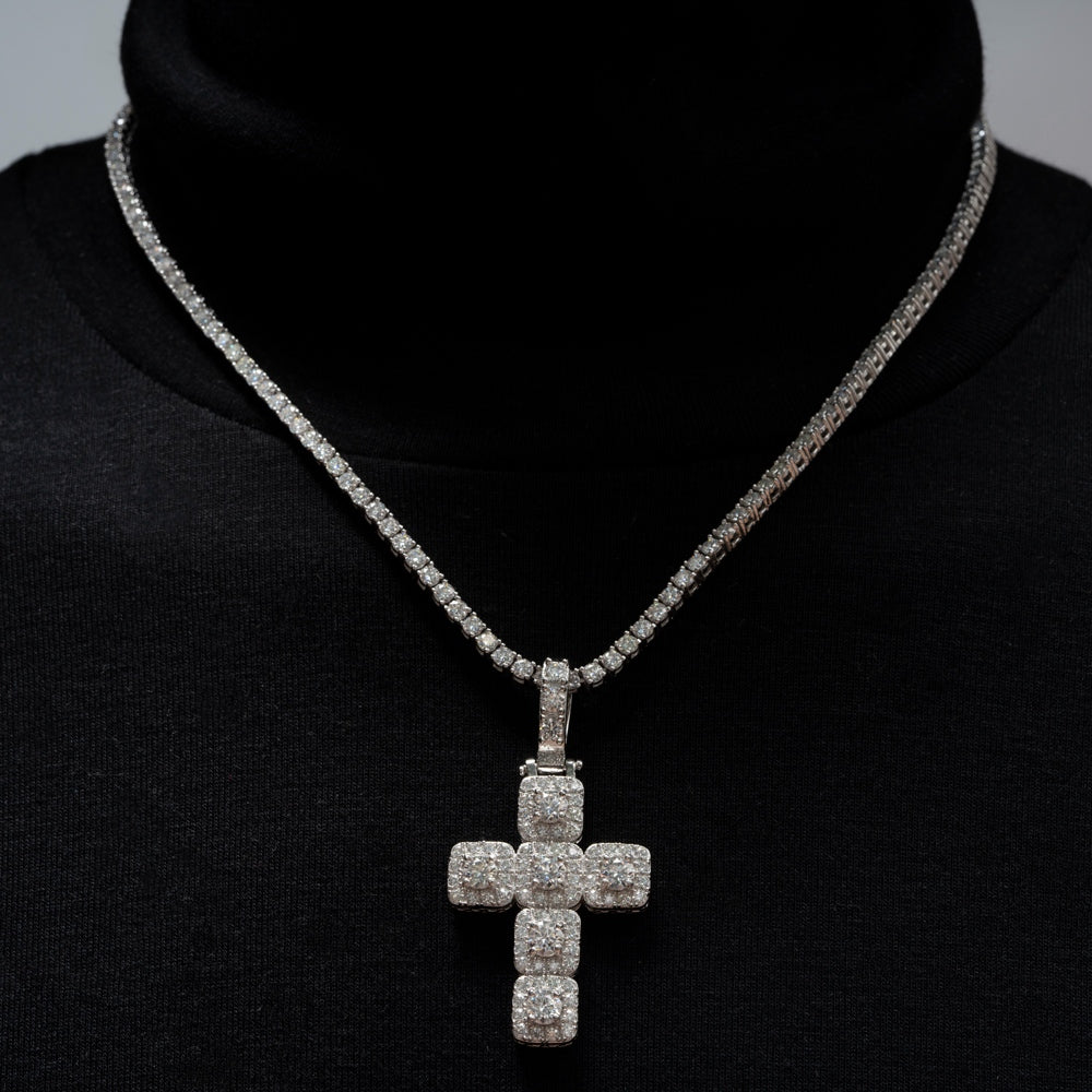 This 925 Sterling Silver necklace features a Cross patterned pendant with a Round Brilliant Cut Moissanite main stone, set in a Claw Setting with 9.25 hardness and VVS clarity. A Certificate Type GRA is provided.