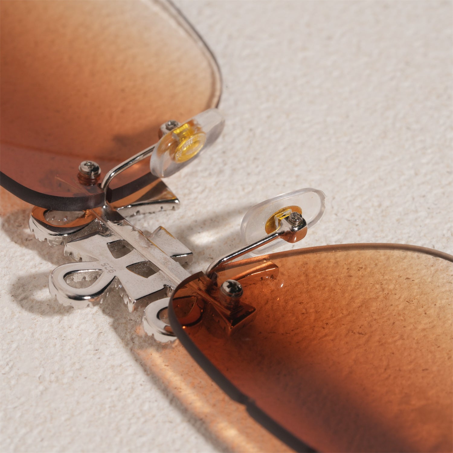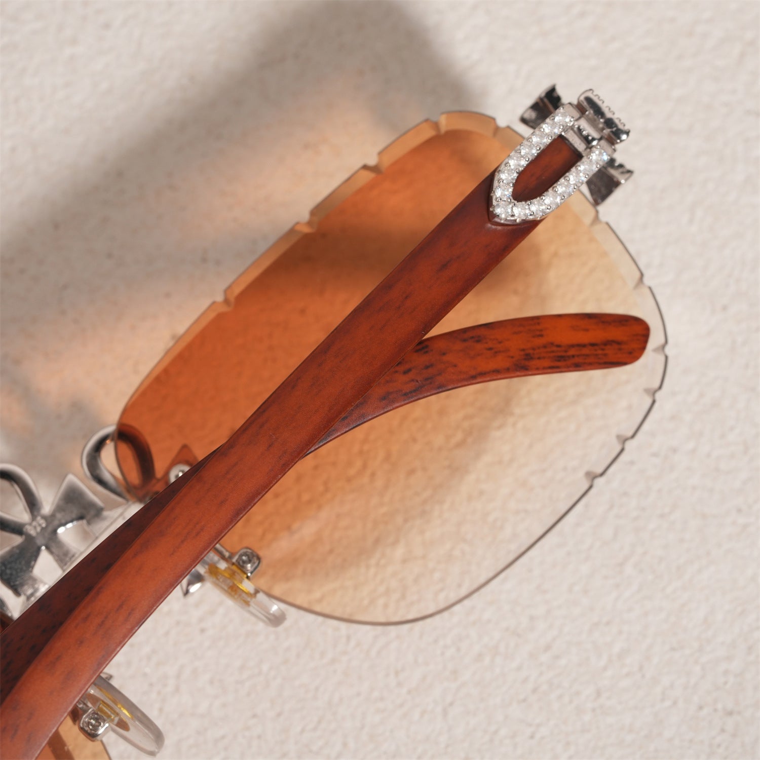 GL Hip-Hop Rimless Sunglasses VVS Moissanite Ankh Bridge & Multicolor Lenses Red Wooden Arms